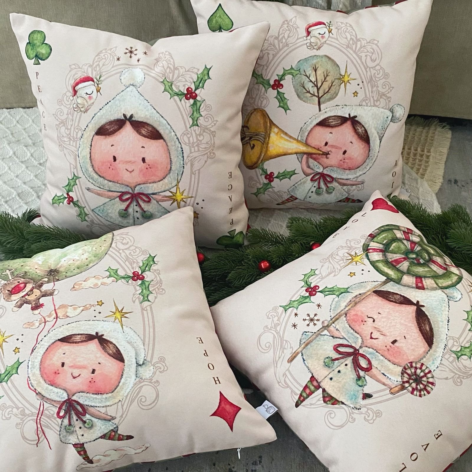 Illustrasi digambar dengan water colour kemudian di print ke sarung bantal.
